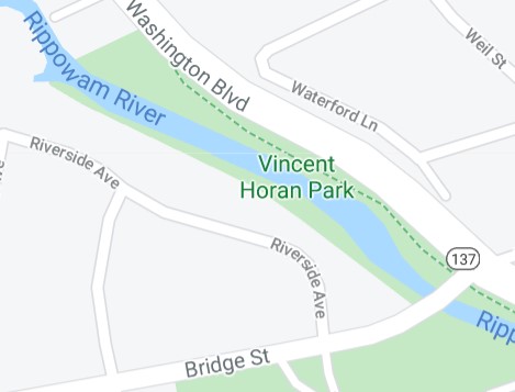 Vincent Horan Park is located at Washington Blvd & Bridge Street in Stamford, CT. It runs along the Rippowam River on both sides.
