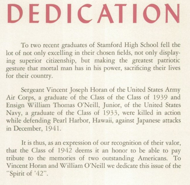 Inasmuch as most of the material in this High School commencement section of The Stamford Advocate, along with the pictures, were taken from “Spirit of ’42,” the Stamford High School’s yearbook published by the Senior Class, it may not be amiss to let the public know who are the boys and girls responsible for this excellent work. The first annual yearbook is published at a time when the world is engulfed in a destructive war and already graduates of Stamford High School have made the supreme sacrifice in the defense of their country. The editors of the “Spirit of ’42” note this fact in the following appropriate words: “To the two recent graduates of Stamford High School fell the lot of not only excelling in their chosen fields, not only displaying superior citizenship but making the greatest patriotic gesture that mortal man has in his power, sacrificing their lives for their country. Sergeant Vincent Joseph Horan of the United States Army Air Corps, a graduate of the Class of 1939, and Ensign William Thomas O’Neill Junior of the United States Navy, a graduate of the Class of 1933, were killed in action while defending Pearl Harbor, Hawaii against Japanese attacks in December 1941. It is, thus, as an expression of our recognition of their valor, that the Class of 1942 deems it an honor to be able to pay tribute to the memories of two outstanding Americans. To Vincent Horan and William O’Neill, we dedicate this issue to the “Spirit of ’42.”