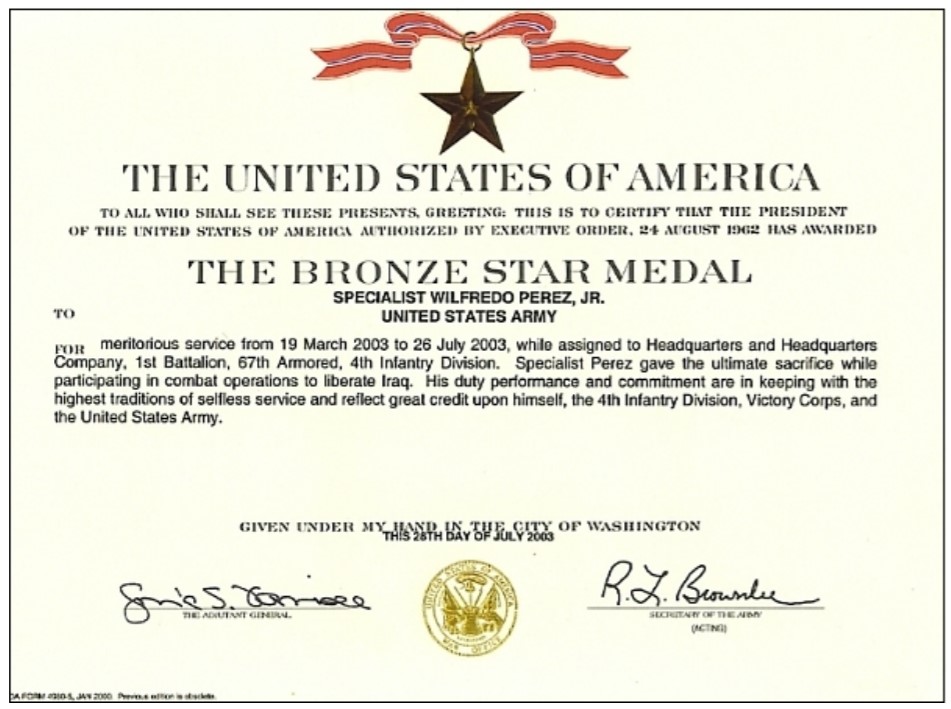 FOR meritorious service from 19 March 2003 to 26 July 2003, while assigned to Headquarters and Headquarters Company, 1st Battalion, 67th Armored, 4th Infantry Division. Specialist Perez gave the ultimate sacrifice while participating in combat operations to liberate Iraq. His duty performance and commitment are in keeping with the highest the highest traditions of selfless service and reflect great credit upon himself, the 4th Infantry Division, Victory Corps, and the United States Army.