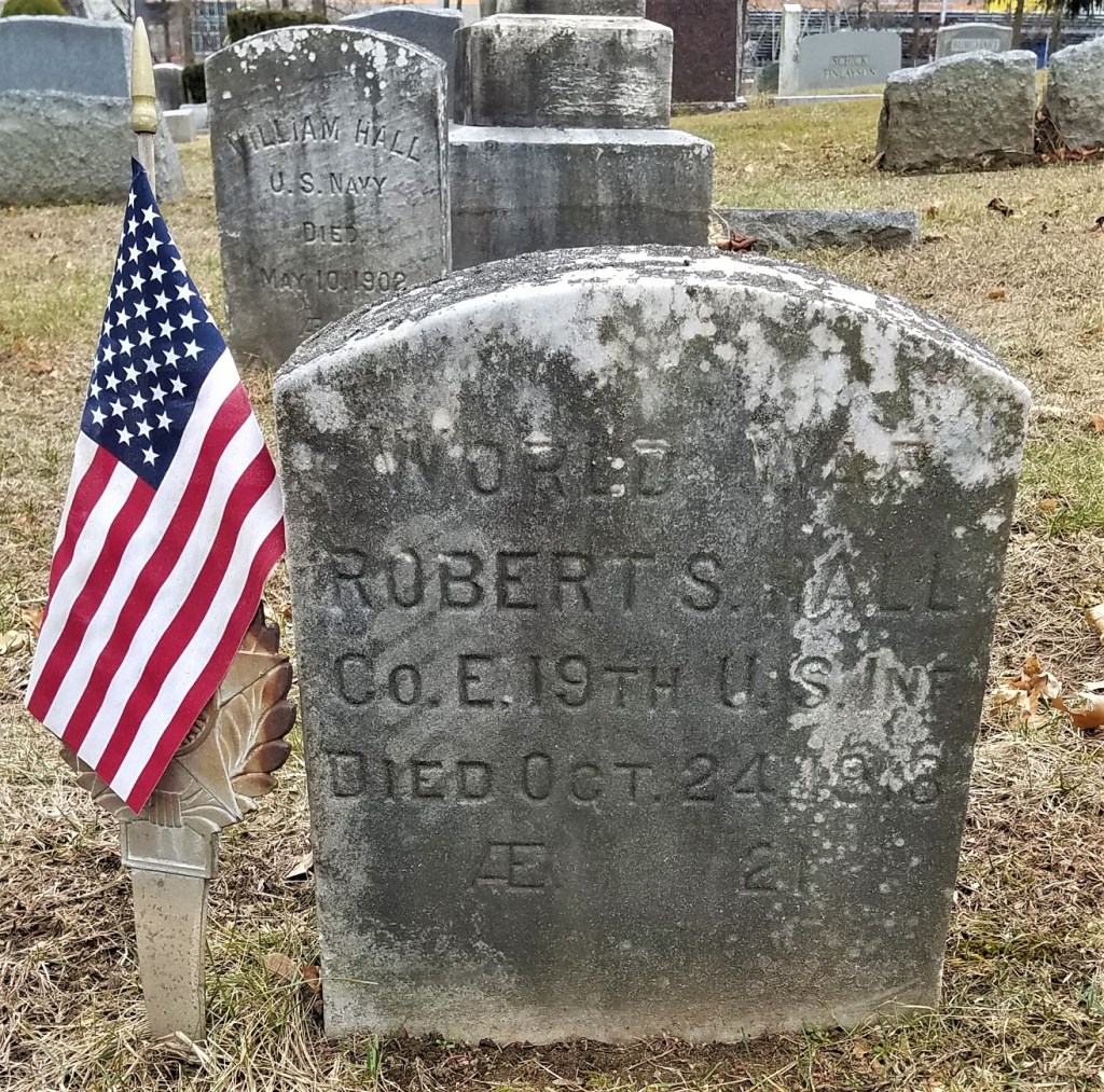 Private Hall is buried at Lakeview Cemetery, 885 Boston Ave, Bridgeport, Connecticut; Avenue B Section, Lot 165. Photo by webmaster.
