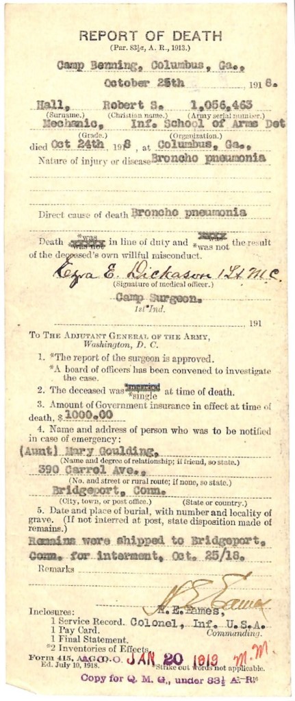 FAMILY: Next of kin was Mrs. Mary “Mae” Hall Goulding (1880-1950), an aunt of 300 Carroll Avenue, Bridgeport. She had two brothers, Wesley (1883-?) and Charles (1894-?). It is likely that Wesley was Private Hall’s father because Charles’s birth year is too close to Private Hall’s. Nothing else was found.