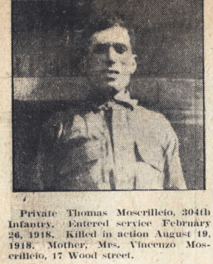 The remains of Private Thomas L Moscariella, Company M, 366th Infantry, who was killed in action on August 19, 1918, while serving his country with the United States Army in France, arrived in this city last evening and was taken charge of by Funeral Director Frederick H. Ganung. Private Moscariella was well known. He was drafted on February 27, 1918. He is survived by his mother and father and one brother, John, of 17 Wood Street. The remains will be placed in the State armory tomorrow morning at 11 o’clock and the funeral will be held with military honors from the Armory at 2 o’clock DST, and from the St. Joseph’s Church at 2:30. The various military organizations of the city will take part, and will pay their last respects to the deceased comrade. The burial will follow in the family plot in St. Mary’s Cemetery.