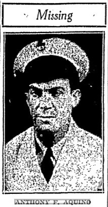 Carmine Aquino of 41 Plymouth Avenue does not know today whether his boy, Anthony (Tony) has gone down with his U.S. Navy ship in the Pacific but he fears the worst. Before the war began, he had hoped that Tony would come home to stay for a while because, in April, Tony would have completed 20 years in the United States Navy and would be eligible for a pension. Now, he can’t tell just what to expect. He has the following message from the Navy Department: