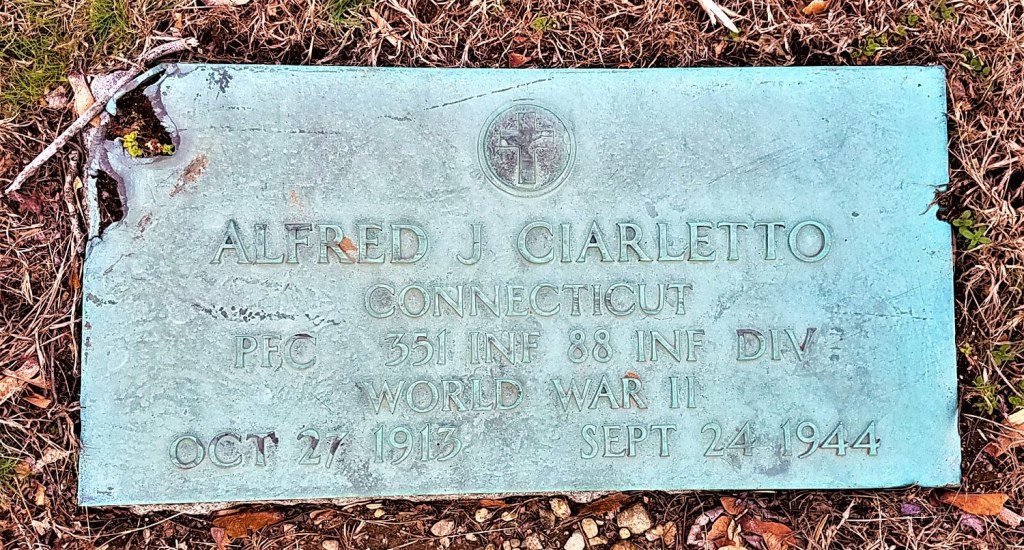Private First Class Alfred J. Ciarletto, son of Mrs. Lena Ciarletto of Silvermine Avenue, was killed in action in Italy on September 24, according to a telegram received by Mrs. Ciarletto from the War Department on Columbus Day. There were no details. A letter will follow shortly, according to the War Department’s telegram. PFC Ciarletto, who would have reached his 31st birthday on October 27, entered the United States Army on August 7, 1941, and after training was sent to Africa. From Africa, he was sent to Italy for action. He has been overseas for about seven months. In civilian life, PFC Ciarletto was employed at the Segal Lock Company on Marshall Street. Besides his mother, he is survived by five brothers, all of this city. They are Carmine, who is in the Army, Anthony, Pasquale, Armando, and Albert.