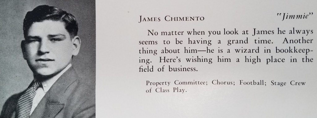 FAMILY: Son of Italian-born Antonio J. (1885-1953) and Rose Cavallo Chimento (1882-1934). Three brothers, Patrick (1907-1994), Joseph (1916-1999), and Antonio “Anthony” (1920-2004). Four sisters, Elizabeth Marie Chimento Perschino (1909-1981), Helen Madeline Chimento Saltarelli (1911-2009), Angeline M. Chimento Arena (1913-2003), and Maria Mildred “Millie” Arena Chakeropulos (1922-2012).