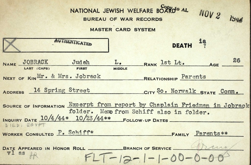 Mr. and Mrs. Samuel Jobrack of 14 Spring Street are waiting for further word today of the death of their son, Lieutenant J. Leonard Jobrack, a 26-year-old Air Force navigator. They received a telegram from the War Department saying their son was killed in Egypt in a collision between two planes on March 27th. Lieutenant Jobrack graduated from Norwalk High School in February 1935 and was President of the class. He was also a graduate of Bates College, Lewiston, Maine, where he served as editor-in-chief of the Bates College yearbook in 1939. He joined the Air Corps in August 1941, served with the ground forces, and became an air cadet in February 1942. He received his commission and wings at the Army Air Force Navigation School in Hondo, Texas. Lieutenant Jobrack had served on other missions in the European war theater. In August of last year, he returned from Africa after a mission. Lieutenant Jobrack has a brother, Harry, who is at Camp Robinson, and a sister, Mrs. Dorothy Wilensky of Stamford.