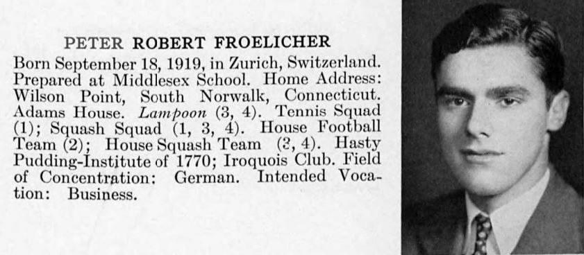 Lieutenant Peter R. Froelicher, son of Mr. and Mrs. Otto Frolicher, Wilson Point, South Norwalk, who has been reported as “missing in action” in North Africa, is a member of the Wee Burn Club, Darien. He is a graduate of Middlesex Preparatory School and attended Harvard University. He enlisted in the summer of 1941 as a cadet in the U.S. Army Air Forces and was assigned to duty in December 1941. He received his training in South Carolina, was commissioned a pilot in August 1942, and went overseas the following month.
