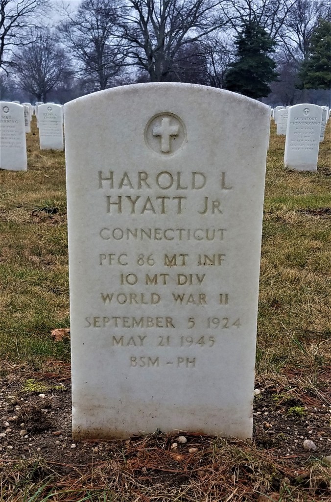 HAROLD L. HYATT JR., 31326774, Private First Class, Infantry, 86th Mountain Infantry, United States Army. For heroic achievement in action on 16 March 1945, near Castel D’Aaiano, Italy. During a night reconnaissance patrol, the enemy opened surprise fire from outpost positions with rifles and grenades, and Private First Class HYATT, the first scout of the group, was wounded. Being unable to walk without assistance, he passed back word to the patrol leader of the location of the hostile emplacements, allowing his comrades to escape from the danger zone without further casualties. He remained alone and was captured by the enemy. His heroic sacrifice probably saved the lives of other patrol members and has proven Private First Class Hyatt worthy of the finest traditions of the United States Army.