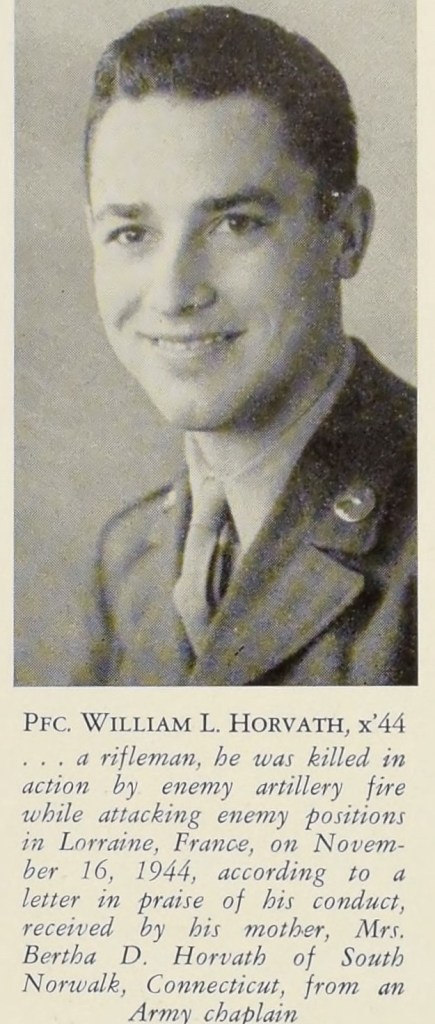 PFC William L. Horvath, the son of Mrs. Bertha D. Horvath of 13 Hamilton Avenue, was killed in action in France on November 16, according to a telegram received this morning by his mother from the office of the adjutant general, Washington DC. PFC Horvath entered the service in June 1943 and went to France in September of this year. Presumably, he went into action immediately. He was born in Pittsburgh on June 20, 1922, the son of the late Reverend Samuel Horvath and Mrs. Bertha Horvath. PFC Horvath graduated from Norwalk High School, Class of 1939, and was a senior at Oberlin College, Oberlin, Ohio, from which institution he entered the service in June 1943. He is survived by his mother and four brothers as follows: Theodore Horvath, Rochester, New York; Sergeant Victor Horvath, U.S. Army, who is in India; Fred Horvath, a cadet at Annapolis Naval Academy; and Edward Horvath, a student at Norwalk High School. PFC Horvath was a nephew of City Comptroller Mrs. Stephen Dokus of this city.