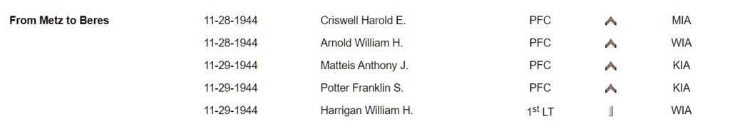 Listed in 95th Infantry Division history as having died on November 29, 1944, between Metz, France, and Beres. The interment record lists “Falck, France,” as the place of death.