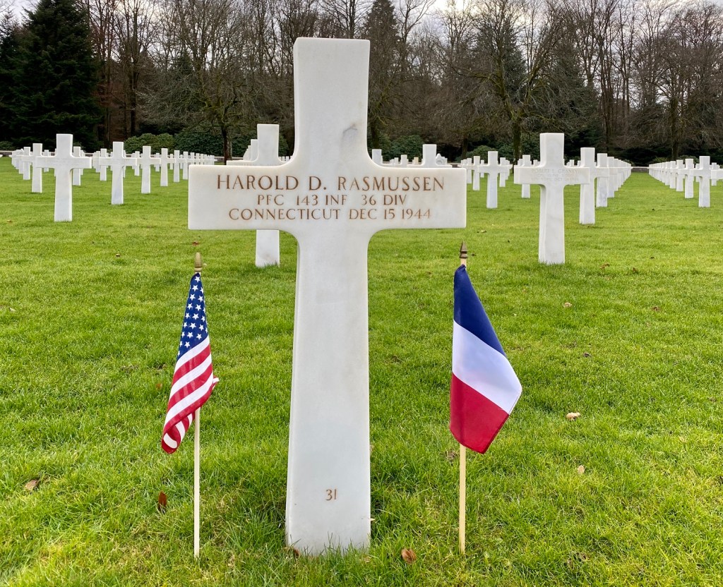 Mrs. Antoinette Rasmussen of 126 Barbara Drive has been notified by the War Department that her husband, PFC Harold D. “Babe” Rasmussen, was killed in action on December 15th somewhere in France. He enlisted in the armed forces on December 11, 1942, and was stationed at Fort Jackson, South Carolina. He went overseas in July 1944. Before going into the service, PFC Rasmussen was with the Superior Castings Corp. on Meadow Street. His wife is the former Miss Antoinette Ritzo, daughter of Michael Ritzo of Norwalk, and his parents are Mr. and Mrs. Emil C. Rasmussen of 256 Rowayton Avenue, Rowayton, Norwalk. His brother, Corporal Walter “Bill” Rasmussen, who was in Germany, has been wounded and is now in a hospital somewhere in England.