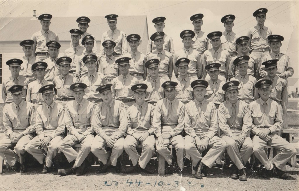 Photo provided by nephew Thomas Tierney. “Attached is a photo dated October 3, 1944. Based on the news articles, I would guess it was a graduation photo of his advanced training class at Walla Walla AAF in the fall of 1944. He is the second from the right on the top row.”