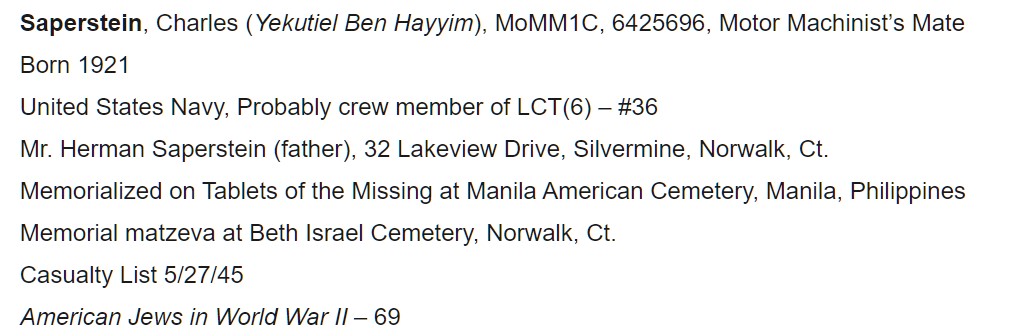 Charles Saperstein, Motor Machinist’s Mate First Class, USNR, son of Mr. and Mrs. Herman Saperstein of 32 Lakeview Drive, has been reported by the Navy Department as missing in the Pacific area since March 15. His parents are hopeful, however, that he is alive and well, judging from a report of him given to them by a customer at their gas station on West Avenue just before they received the official notice. They have been anxious to contact their informant to ascertain details of a meeting of Saperstein and her husband somewhere in the Philippines. Saperstein has been in the service since September 21, 1942, and was last home in the fall of 1943, going to the Pacific area in December. His last letter home, written on March 7, was received on March 16., He has two brothers in the service; Irving Saperstein, US Army, in the country, and Warrant Officer Sol Saperstein, in the Pacific area.