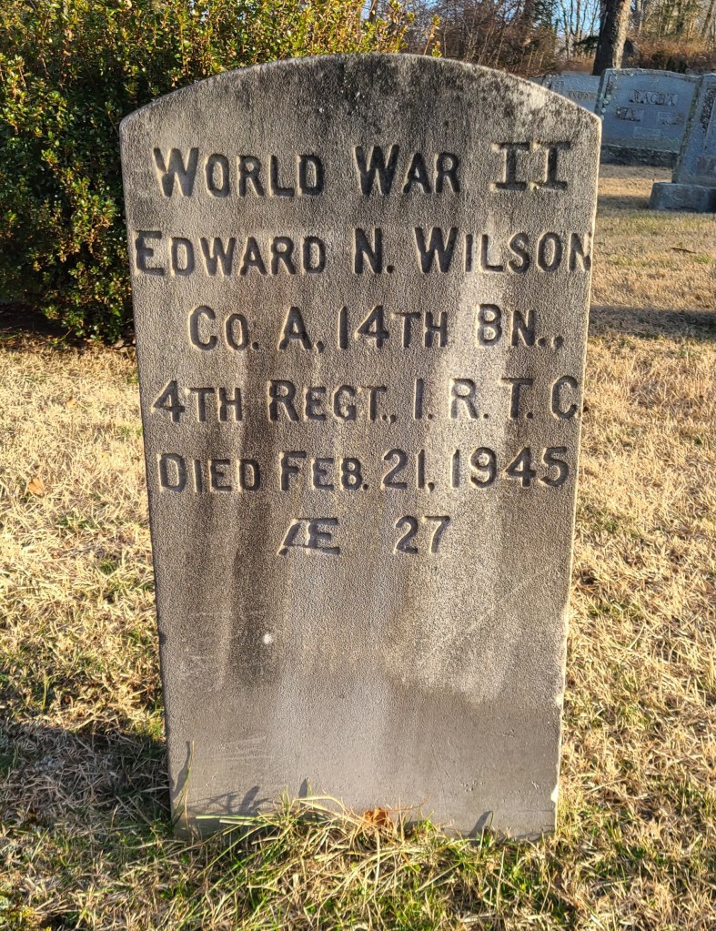 PFC Edward N. Wilson of 11 Fitch Street died at the Station Hospital at Camp Gordon [Fort Eisenhower as of 2023], Georgia, on Wednesday following injuries sustained in a maneuvering accident. Private First Class Wilson is survived by his wife, Mrs. Marion Wilson; his father and mother, Mr. and Mrs. Edward Wilson; three sisters, Mrs. Lois Boyce, Mrs. Martha Zahn, and Mrs. Ruth Browne; and one brother, Robert Wilson III, of this city. Before entering the service, PFC Wilson was employed at the Segal Lock Company for several years. Funeral arrangements in charge of the A.J. Collins Company will be announced later.