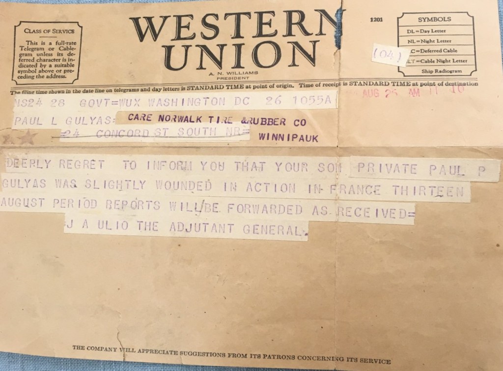Private Paul Gulyas Jr., son of Mr. and Mrs. Paul Gulyas Sr., of 24 Concord Street, was slightly wounded in action in France about 10 days ago, according to a telegram received by his parents on Saturday from the War Department. Private Gulyas, who is with the Medical Corps, has been in the service for almost three years and went overseas in January.