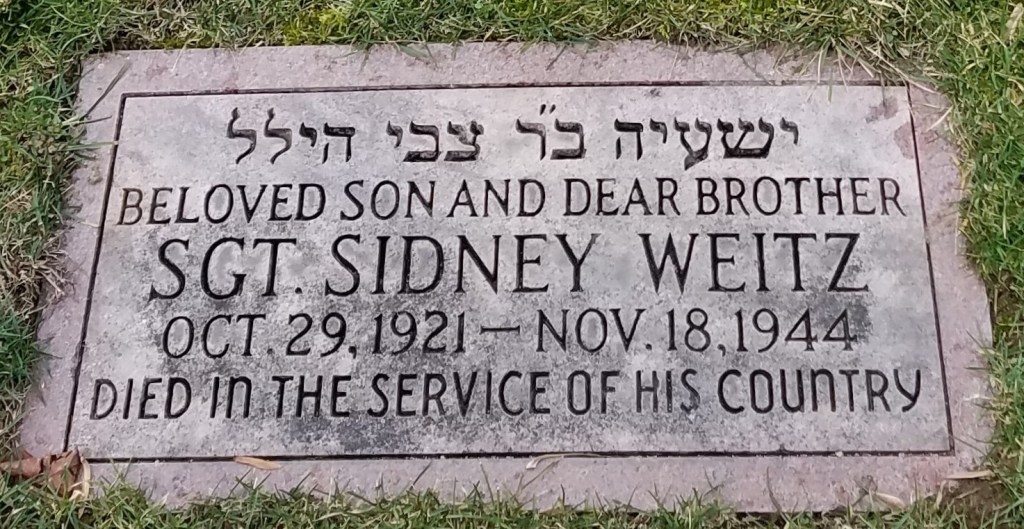 Purple Heart Medal image contributed by Ben Woessner on April 1, 2022. Sgt Weitz was killed in action in Germany. After temporarily being buried overseas at Margraten American Cemetery in the Netherlands, his remains were repatriated and buried in the Baron Hirsch Cemetery, Staten Island. In May 1966, he was moved to Connecticut. His final resting place is Beth El Cemetery, where he was reinterred on June 15, 1966.