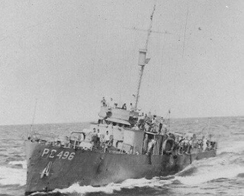 OTHER: He was wounded when his ship, Patrol Craft USS PC-496, was destroyed by an Italian torpedo off the coast of Bizerte, Tunisia, on June 4, 1943. He survived by holding on to a floating ice box from the ship’s kitchen until he was rescued.