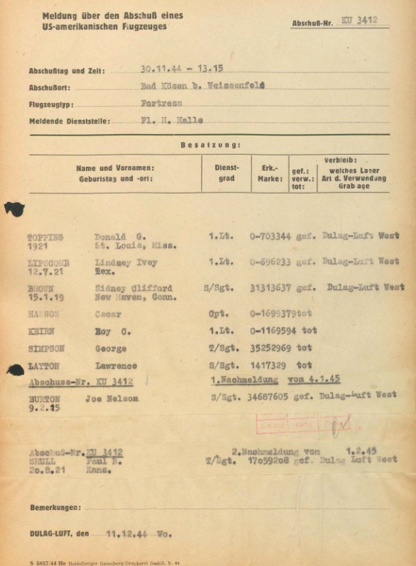 Plane was at 27,500 feet when it received a direct hit y flak in the Number 2 engine. The plane slid under the formation with the engine on fire. After all the crew did an oxygen check, the wing exploded, and only 5 of 9 crew members were able to exit the plane and deploy parachutes. While in POW camps, German soldiers made contradicting statements that four of the crew who weren’t in the camp were hung by civilians after they bailed out but also that they had died in the crash.