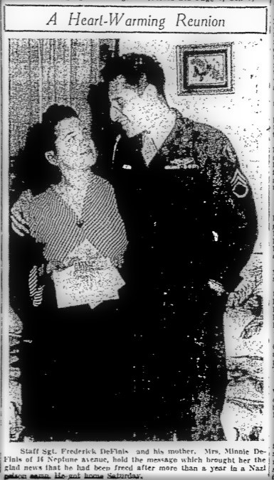 Sergeant Frederick De Finis of 16 Neptune Avenue, reported missing in action over the European Theatre on March 16, is a prisoner of the Germans according to a telegram from the War Department received yesterday by his parents, Mr. and Mrs. John De Finis. Sergeant De Finis enlisted in the U.S. Army Air Corps on November 28, 1942. He trained at Fort Devens and in Gulfport, Mississippi. He is a widely known athlete, having starred on the Norwalk High School football and baseball teams. He was also an amateur welterweight boxer and won the championship of the Gulfport camp when he was stationed there. He graduated from Norwalk High School with the June 1942 class.