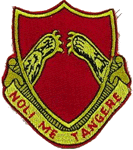The shield is scarlet for Artillery. The lion’s paws are significant for the Field Artillery, which may be likened to a mountain lion whose paws have great strength and power in felling and crushing a victim. Enscrolled beneath the shield is the motto “Noli Me Tangere,” which translates to “Touch Me Not.”