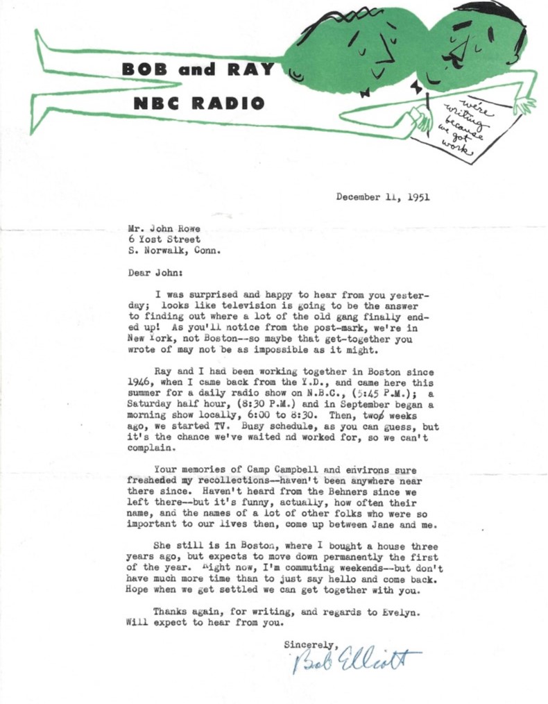 This is a letter from Bob Elliot to John Rowe Sr., who were friends. Bob was part of the radio duo “The Bob and Ray Show.” Contributed by John Rowe, Jr.