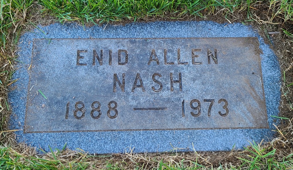 Enid Nash is buried in Spring Grove Cemetery, 41 Hecker Avenue, Darien, Connecticut; Section P, Grave 8, overlooking the pond.