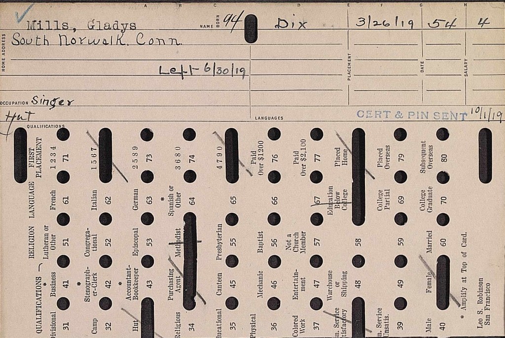 SERVICE DATES: Worked as a singer for the YMCA from March 26, 1919, to June 30, 1919.