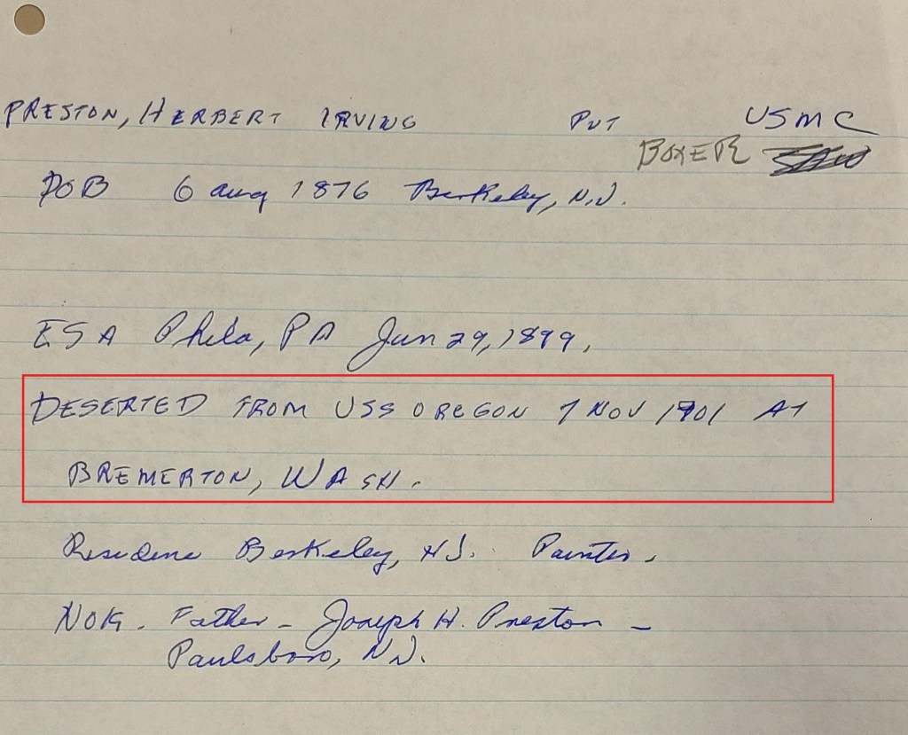 IMPORTANT NOTE: Private Preston was assigned to the USS Oregon at the time of the actions that earned him the Medal of Honor. The lack of notoriety about his receiving the Medal of Honor is because he deserted from the U.S. Navy on November 7, 1901. That fact has been officially recorded by the Congressional Medal of Honor Society. The medal is never mentioned in the articles about his death or in his obituary. This is the note from the files at the Congressional Medal of Honor Society, retrieved by the webmaster: